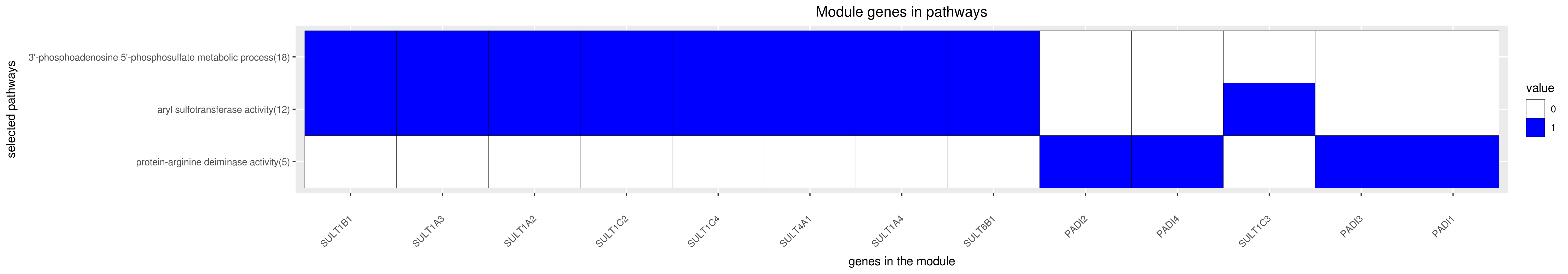 Modules were tested for enrichment in functional and pathway annotations using two complementary approaches: