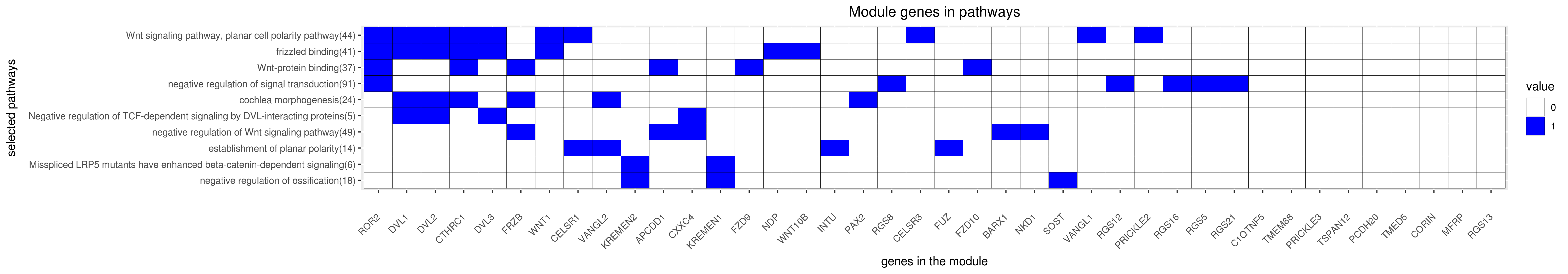 1. To select a small number of specific / non-redundant annotations for each module, a regression-based approach was used;