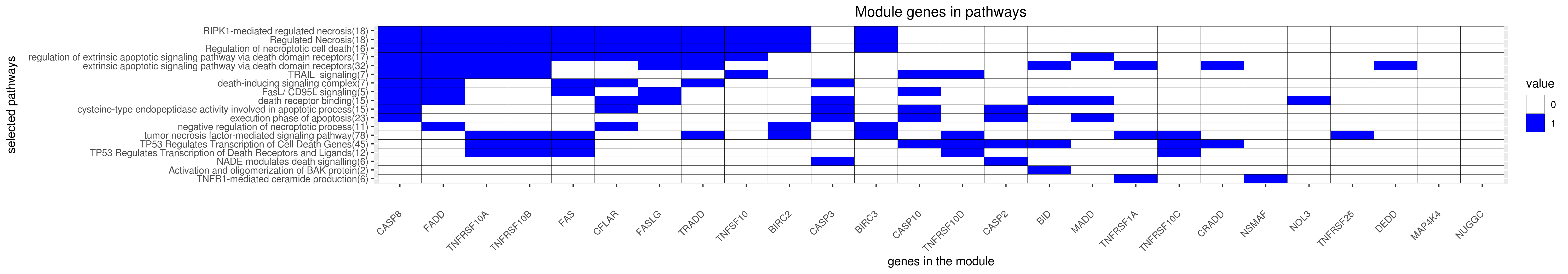 Modules were tested for enrichment in functional and pathway annotations using two complementary approaches: