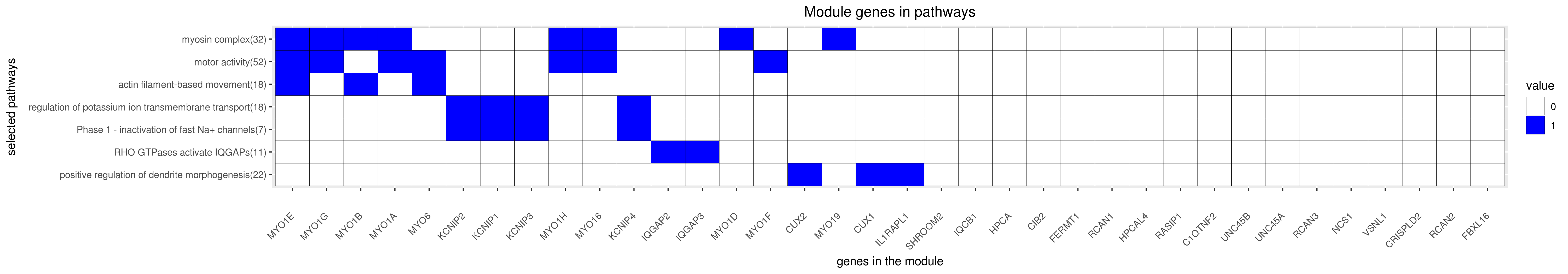 Modules were tested for enrichment in functional and pathway annotations using two complementary approaches: