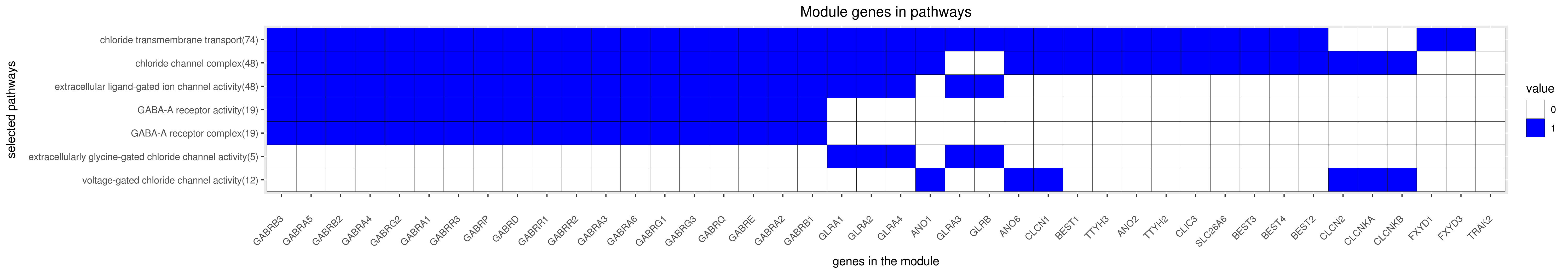 Modules were tested for enrichment in functional and pathway annotations using two complementary approaches: