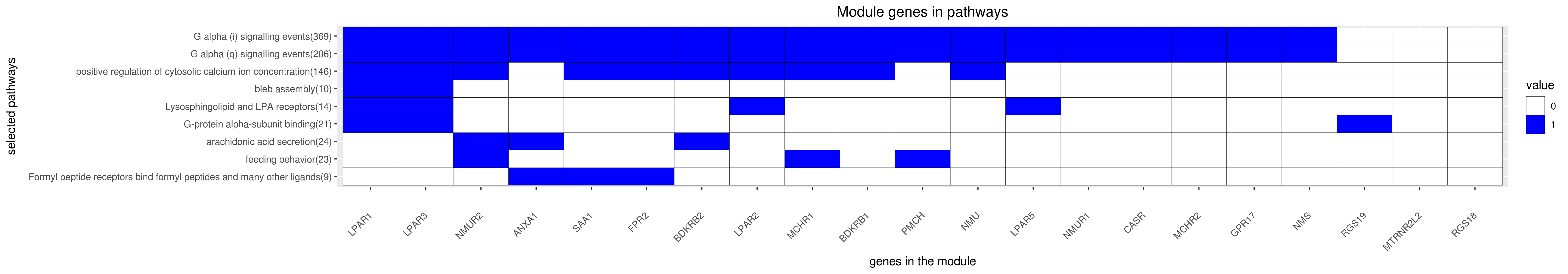 Modules were tested for enrichment in functional and pathway annotations using two complementary approaches: