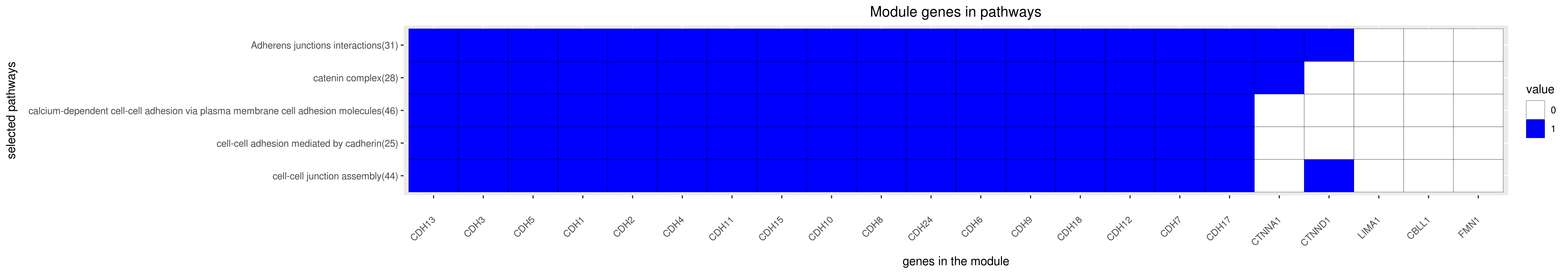 Modules were tested for enrichment in functional and pathway annotations using two complementary approaches: