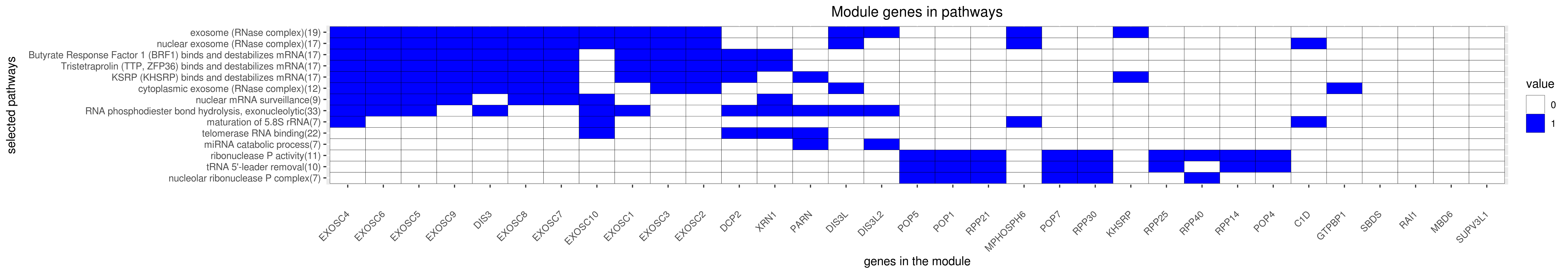 Modules were tested for enrichment in functional and pathway annotations using two complementary approaches: