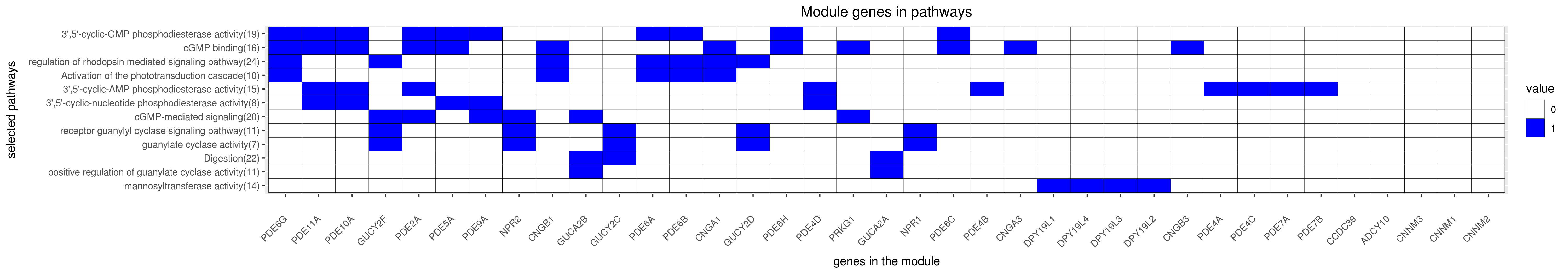 Modules were tested for enrichment in functional and pathway annotations using two complementary approaches: