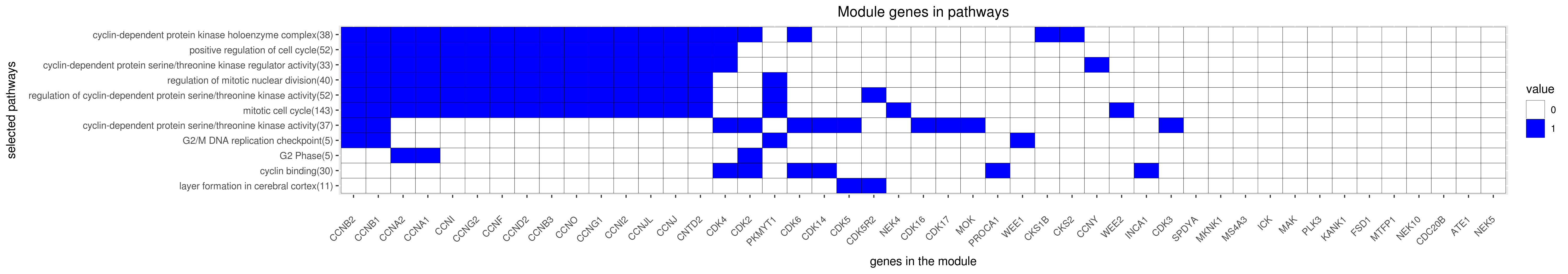1. To select a small number of specific / non-redundant annotations for each module, a regression-based approach was used;