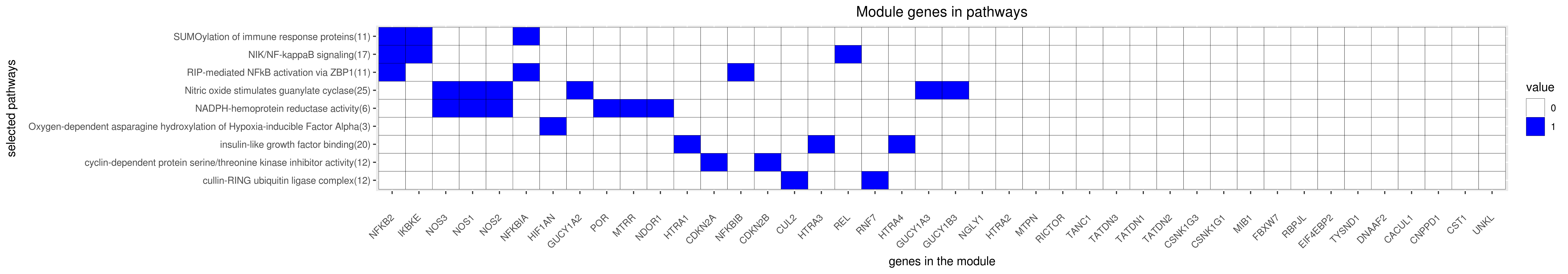 Modules were tested for enrichment in functional and pathway annotations using two complementary approaches: