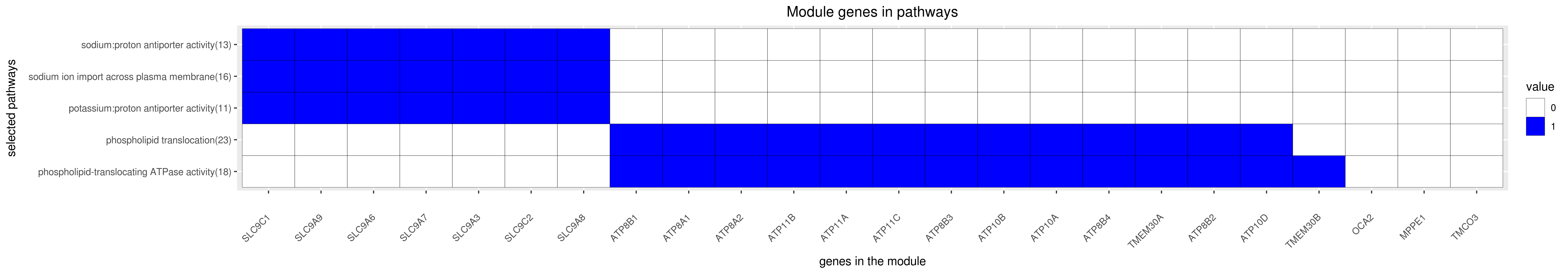 Modules were tested for enrichment in functional and pathway annotations using two complementary approaches: