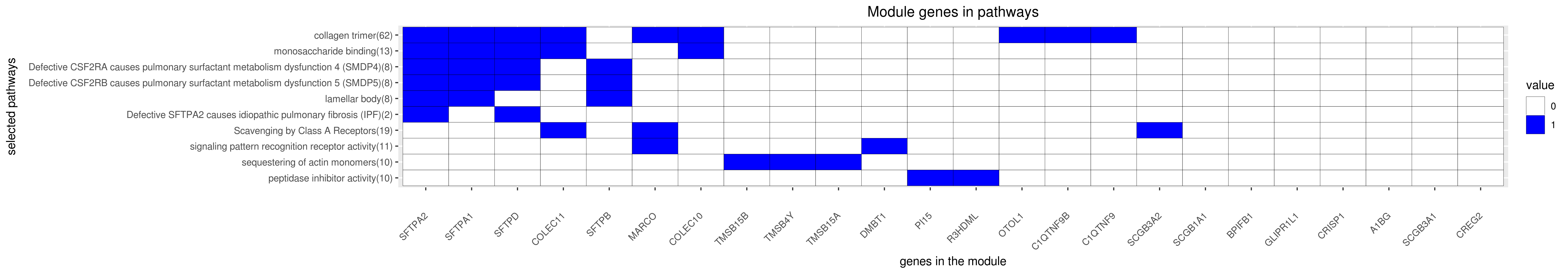 Modules were tested for enrichment in functional and pathway annotations using two complementary approaches: