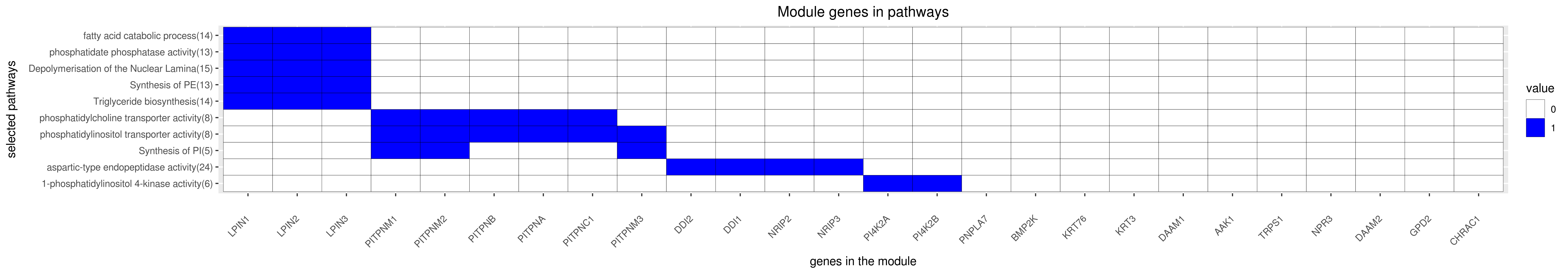Modules were tested for enrichment in functional and pathway annotations using two complementary approaches: