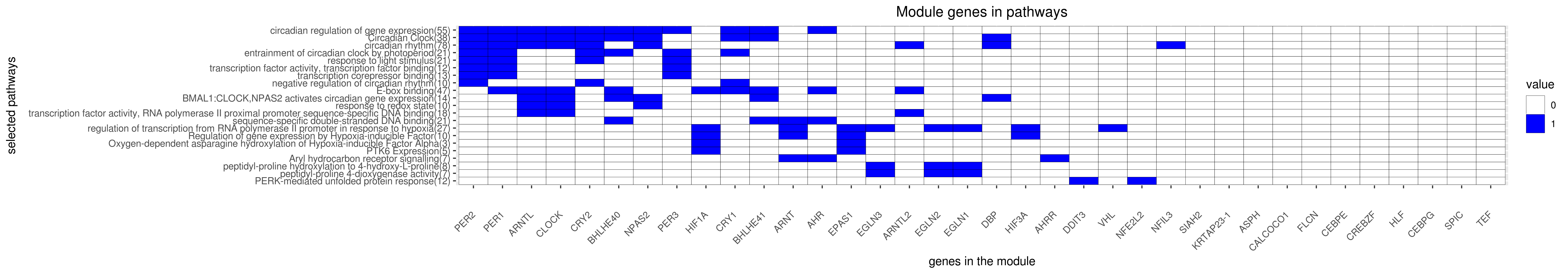 Modules were tested for enrichment in functional and pathway annotations using two complementary approaches:
