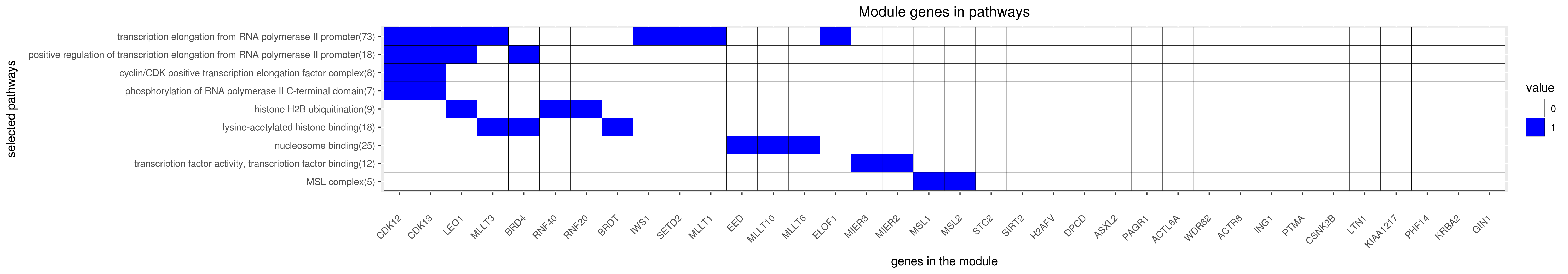 1. To select a small number of specific / non-redundant annotations for each module, a regression-based approach was used;
