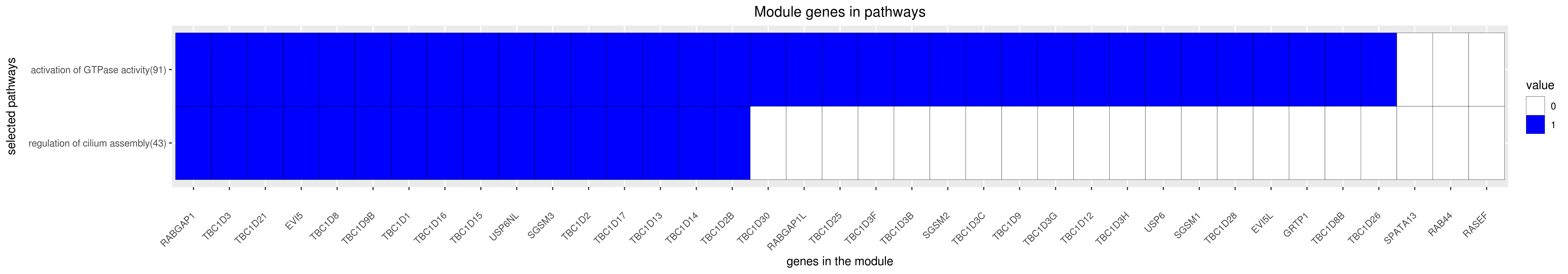Modules were tested for enrichment in functional and pathway annotations using two complementary approaches: