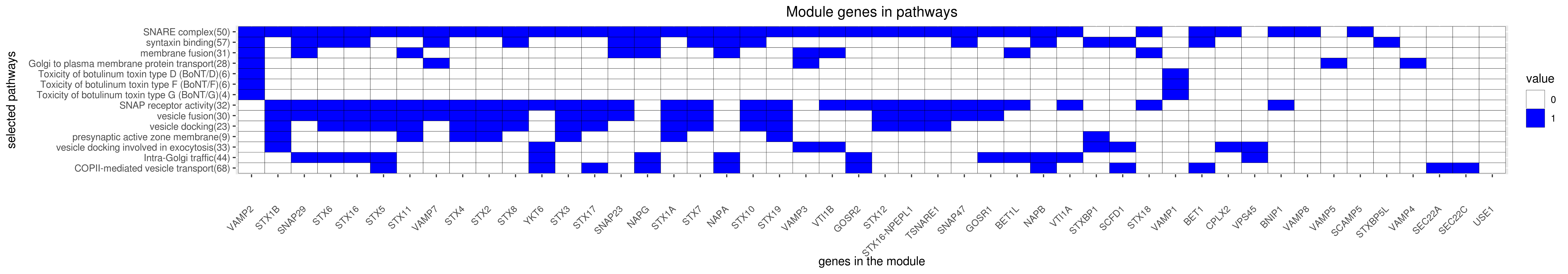 1. To select a small number of specific / non-redundant annotations for each module, a regression-based approach was used;