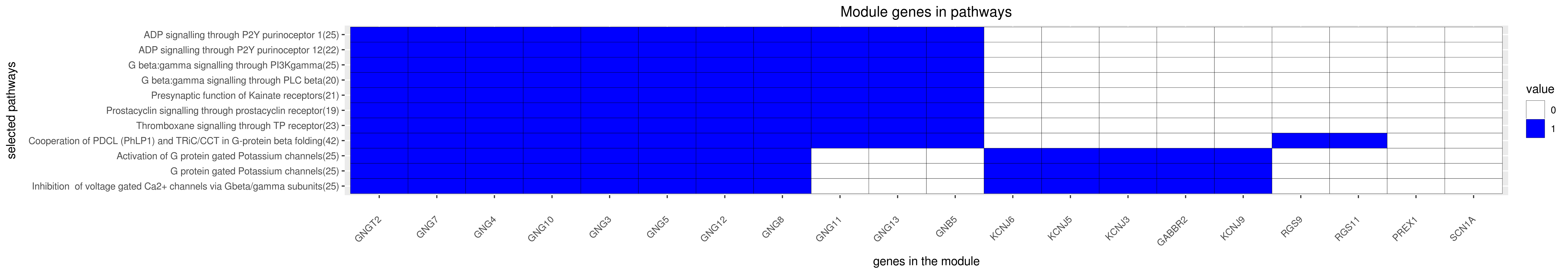 Modules were tested for enrichment in functional and pathway annotations using two complementary approaches: