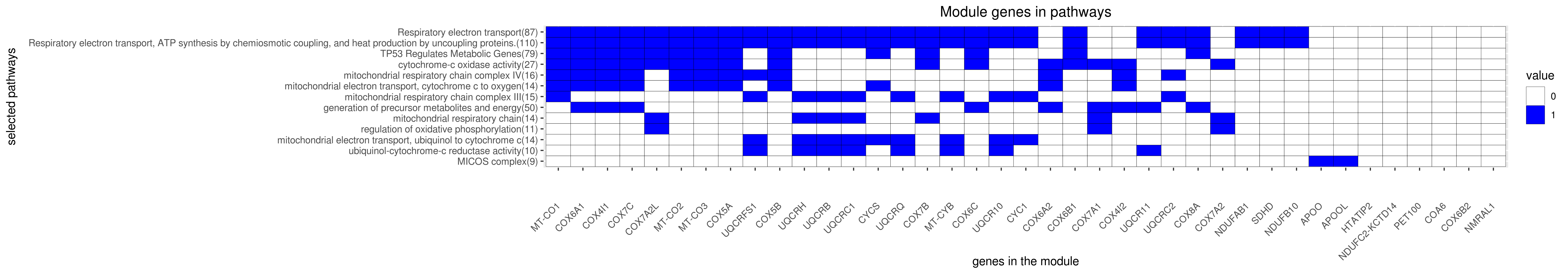 Modules were tested for enrichment in functional and pathway annotations using two complementary approaches:
