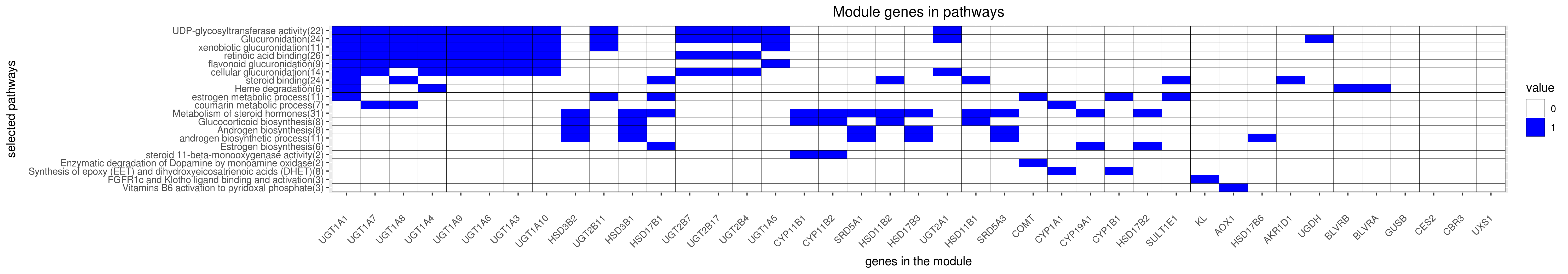 Modules were tested for enrichment in functional and pathway annotations using two complementary approaches: