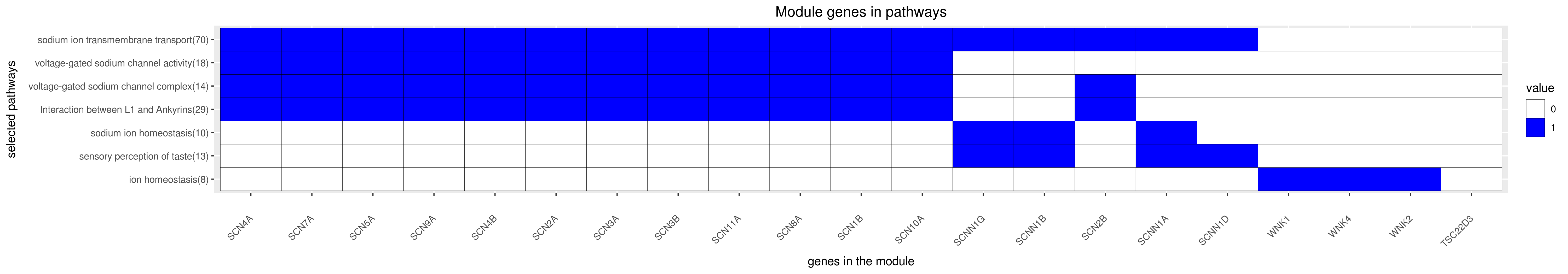 Modules were tested for enrichment in functional and pathway annotations using two complementary approaches:
