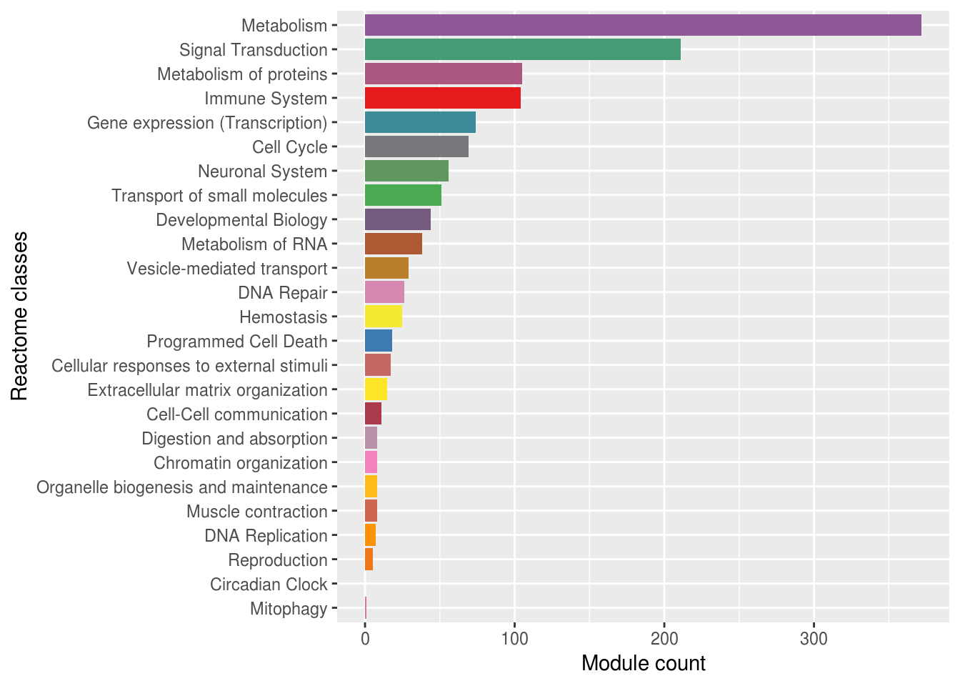 scale_fill_manual(values=reactome_colors_noDisease[reactome_classes[order(reactome_class2moduleCount_noDisease$module_num)]])+