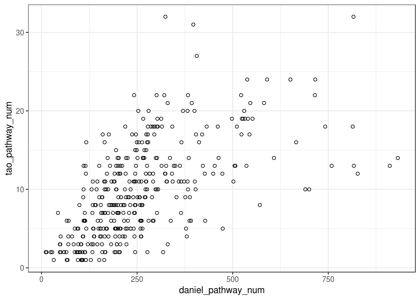 ggplot(scatter_plot, aes(x=daniel_pathway_num, y=tao_pathway_num)) + geom_point(shape=1) +