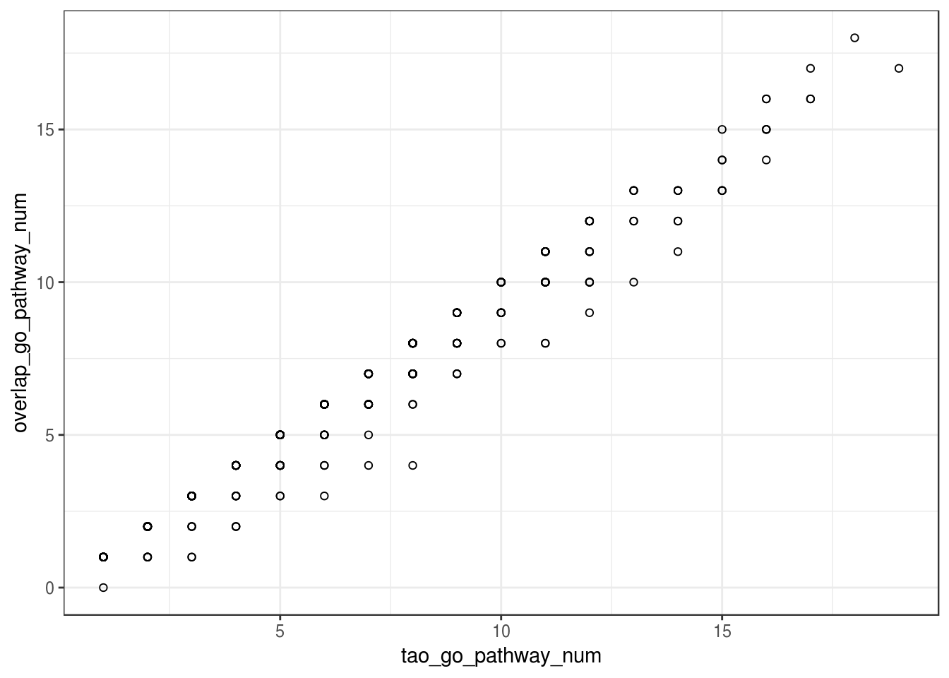 ggplot(overlap_go_terms_frame, aes(x=tao_go_pathway_num, y=overlap_go_pathway_num)) + geom_point(shape=1) +